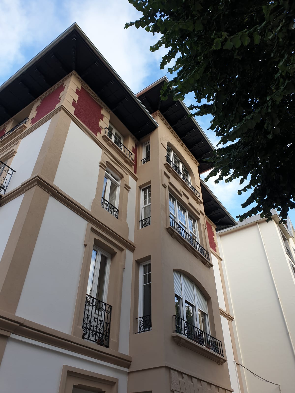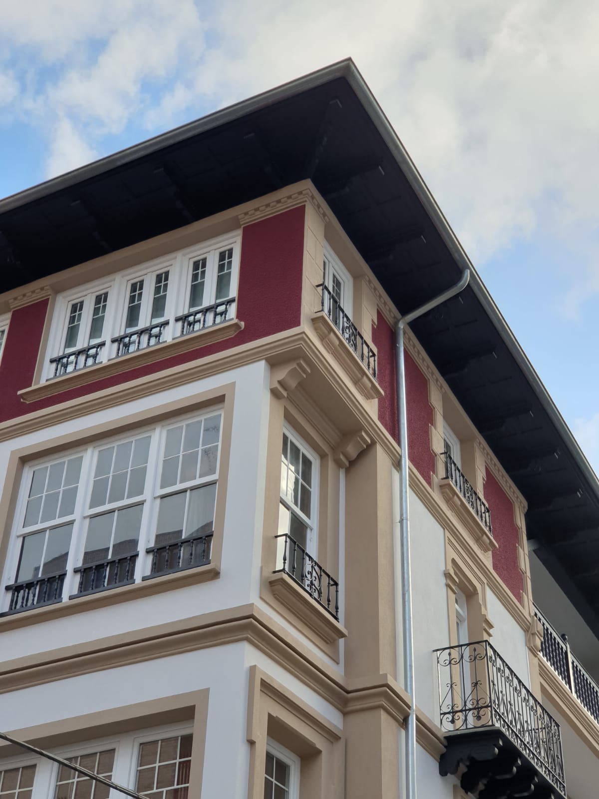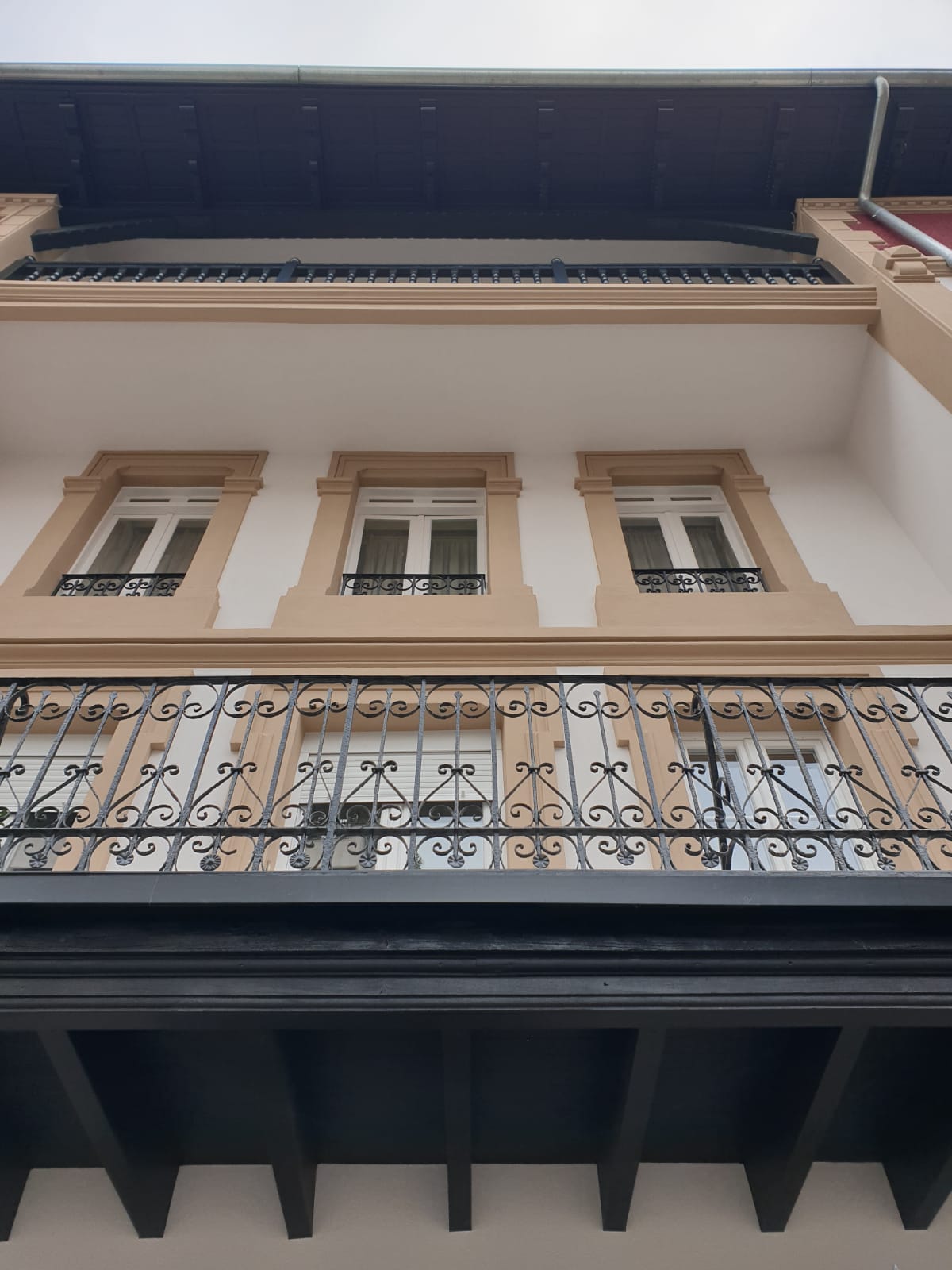 Las fachadas se han rehabilitado de manera convencional, respetando y restituyendo las molduras, restaurando la herrería, reparando las carpinterías y demás elementos de madera tales como aleros y vuelos.